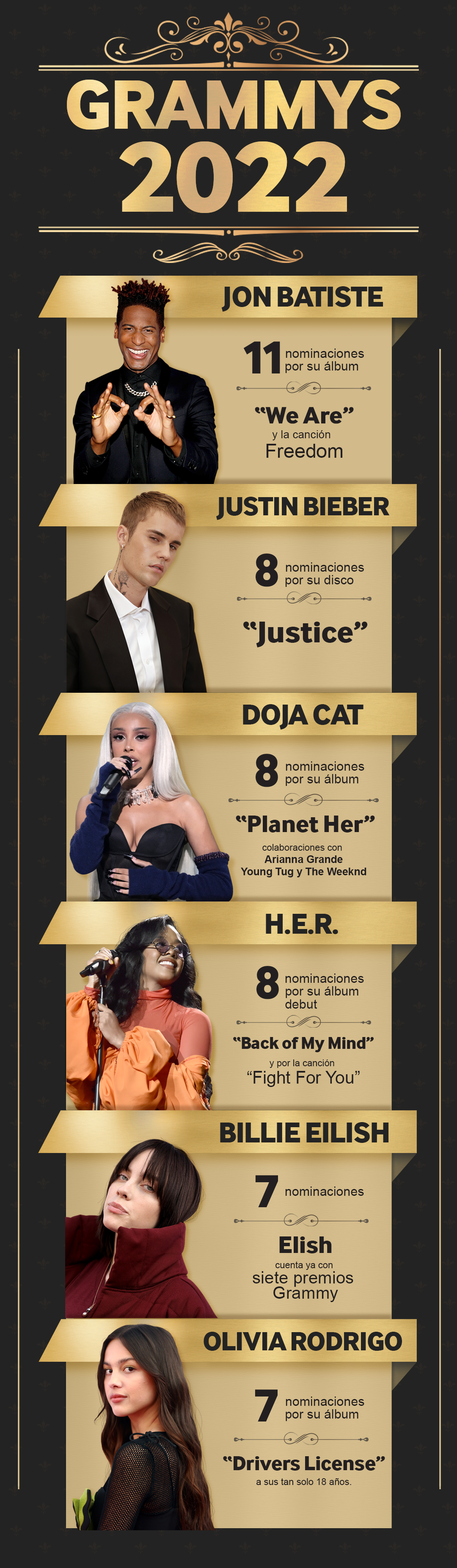 La cantante H.E.R. también se suma a la lista de 8, gracias a su álbum debut “Back of My Mind” y por la canción “Fight For You” (la cual es favorita debido a que ya ganó en los Oscar como Mejor Canción Original), se encuentra entre las categorías más relevantes, así como en las que domina, como: Mejor Álbum R&B, Mejor Interpretación de R&B Tradicional, Mejor Canción Escrita para Visuales, Mejor Interpretación R&B, Mejor Canción R&B y Mejor Canción Contemporánea Cristiana.