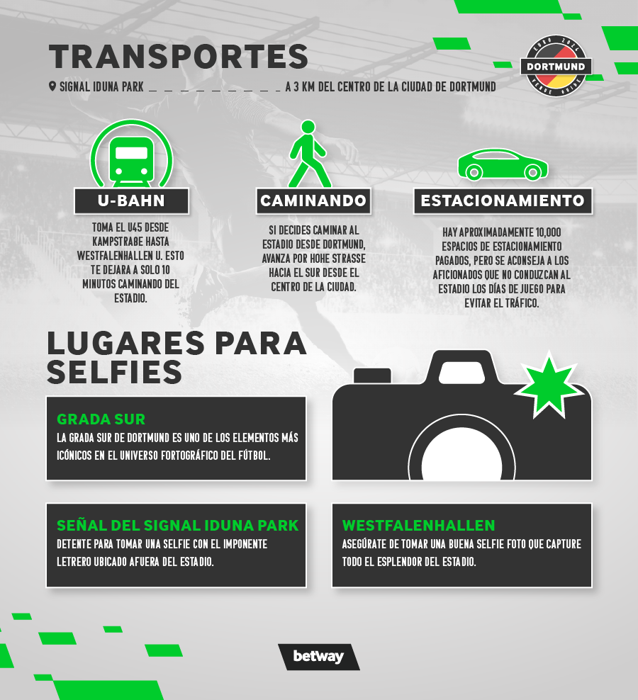 - Fumar: No está permitido fumar en el Signal Iduna Park, y no habrá zonas específicas para fumadores. La prohibición de fumar se aplica a todas las sedes de la Eurocopa 2024.