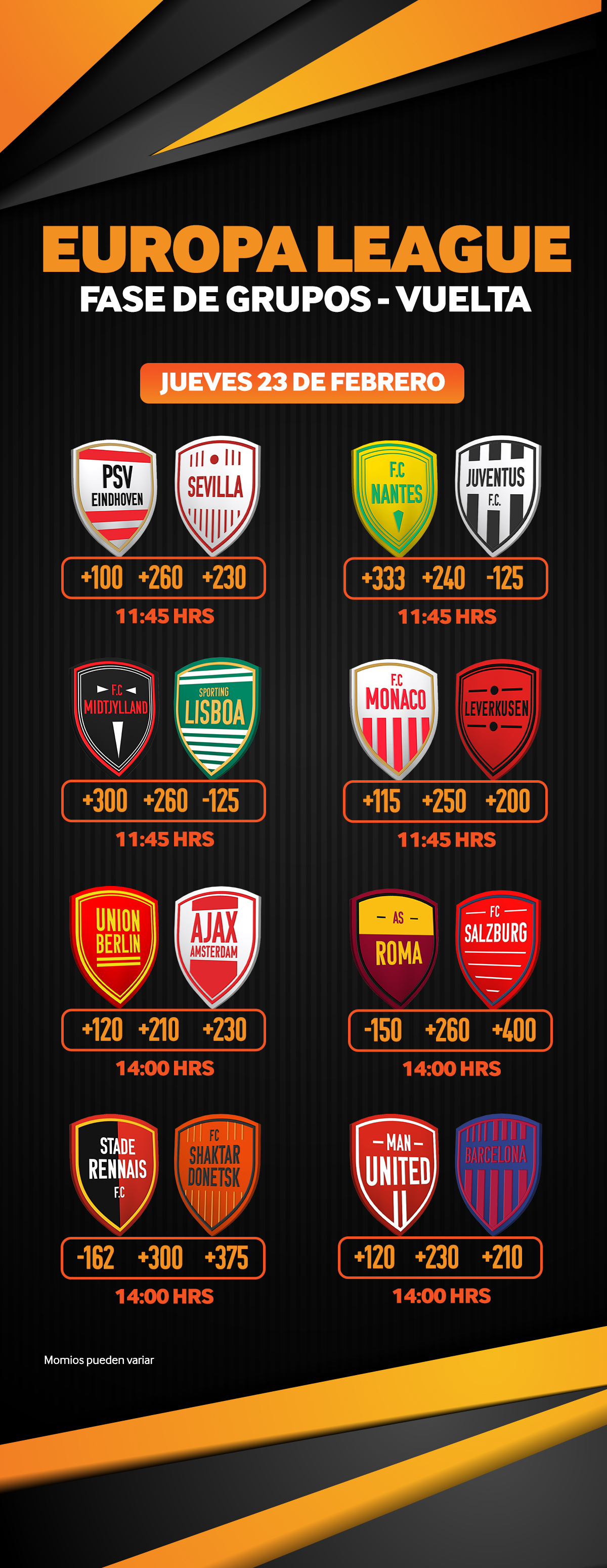 Para sorpresa de muchos, el que fuera el torneo internacional “segundón” del fútbol de clubes europeo nos está dando un auténtico deleite con los partidos de dieciseisavos de final. Sin duda, la serie que más ha agitado las líneas de apuestas y momios del fútbol internacional es la que protagonizan Barcelona y Manchester United. Sin embargo, no son los únicos que están dando la batalla. Equipos como Juventus, Monaco o Sevilla, también competidores de altísmimo nivel en anteriores ediciones de la Champions buscan resurgir en esta competencia, y, para ello, deberán salir con buenos resultados de los partidos de vuelta.