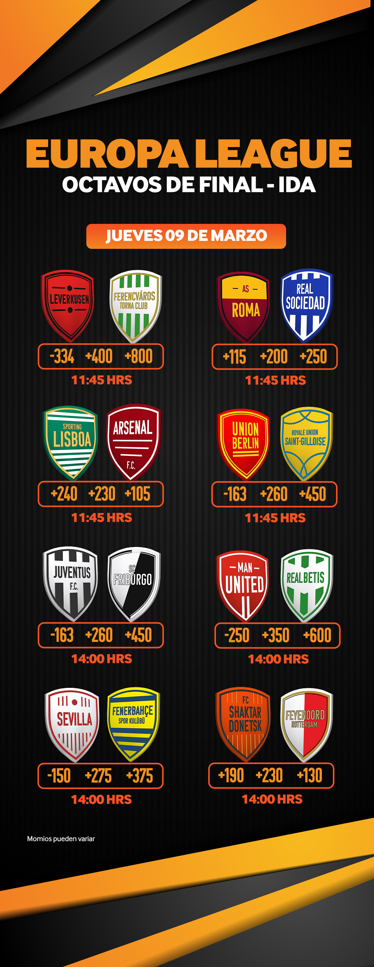 ¿Vas a meter tus apuestas de fútbol en estos partidos? Prepárate, porque la intensidad que ya traen por naturaleza estos encuentros se va a magnificar con las líneas de apuesta y momios que vamos a tener en esta ronda de Apuestas Europa League en Betway México.