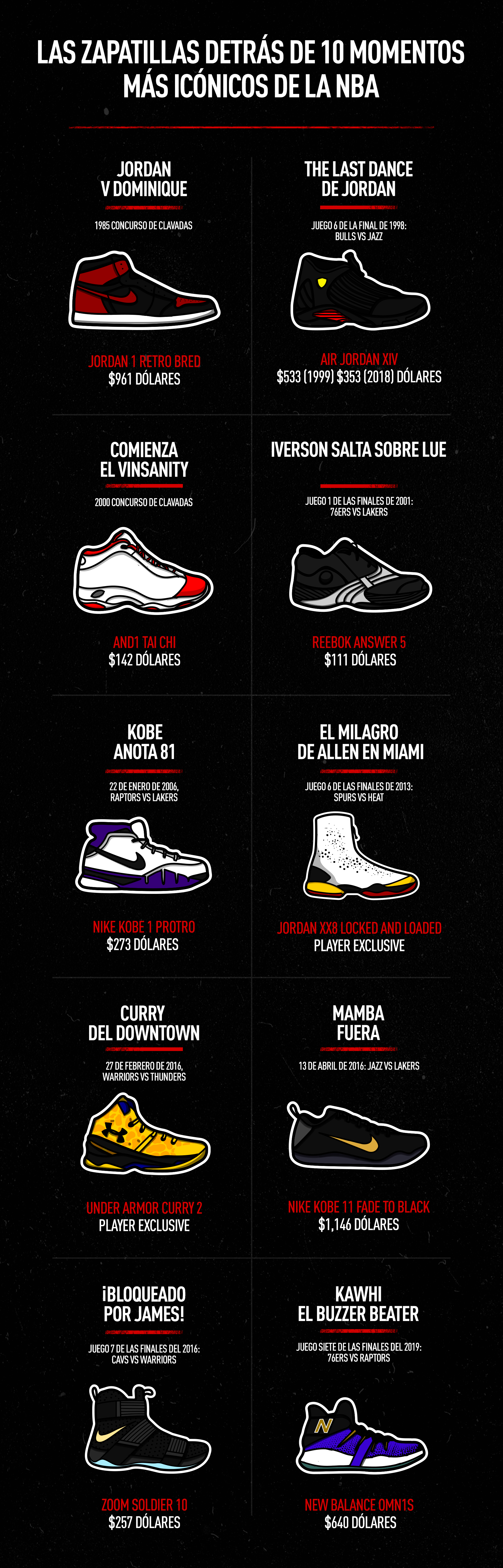 Desde el prohibido Air Jordan 1 de 1985 hasta los Under Armours con el estampado de jirafas de Steph Curry, estos son los tenis que las estrellas de la NBA usaron para sus mejores momentos.