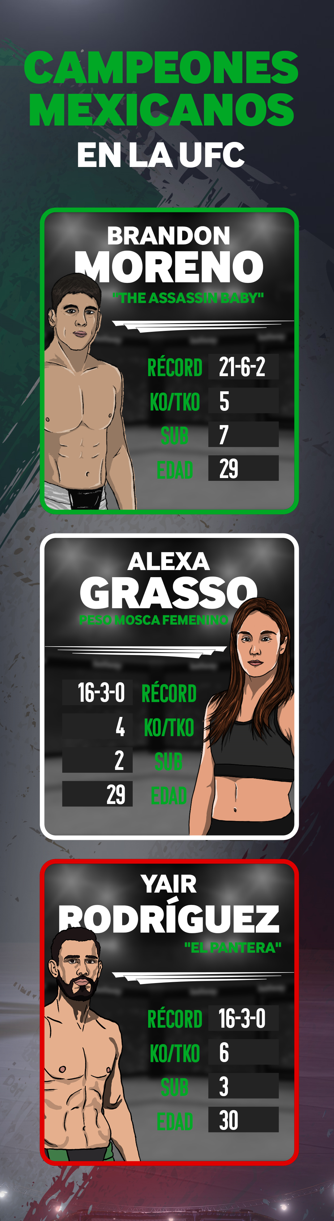 Llámenlos como lo que son: campeones. Estos tres peleadores han marcado una época en la UFC y en el deporte en México. Han demostrado la capacidad, el empeño y el valor de los atletas mexicanos para competir a nivel mundial y, ahora, muchos jóvenes podrán ver en ellos los ejemplos a seguir para cumplir sus sueños en las MMA.